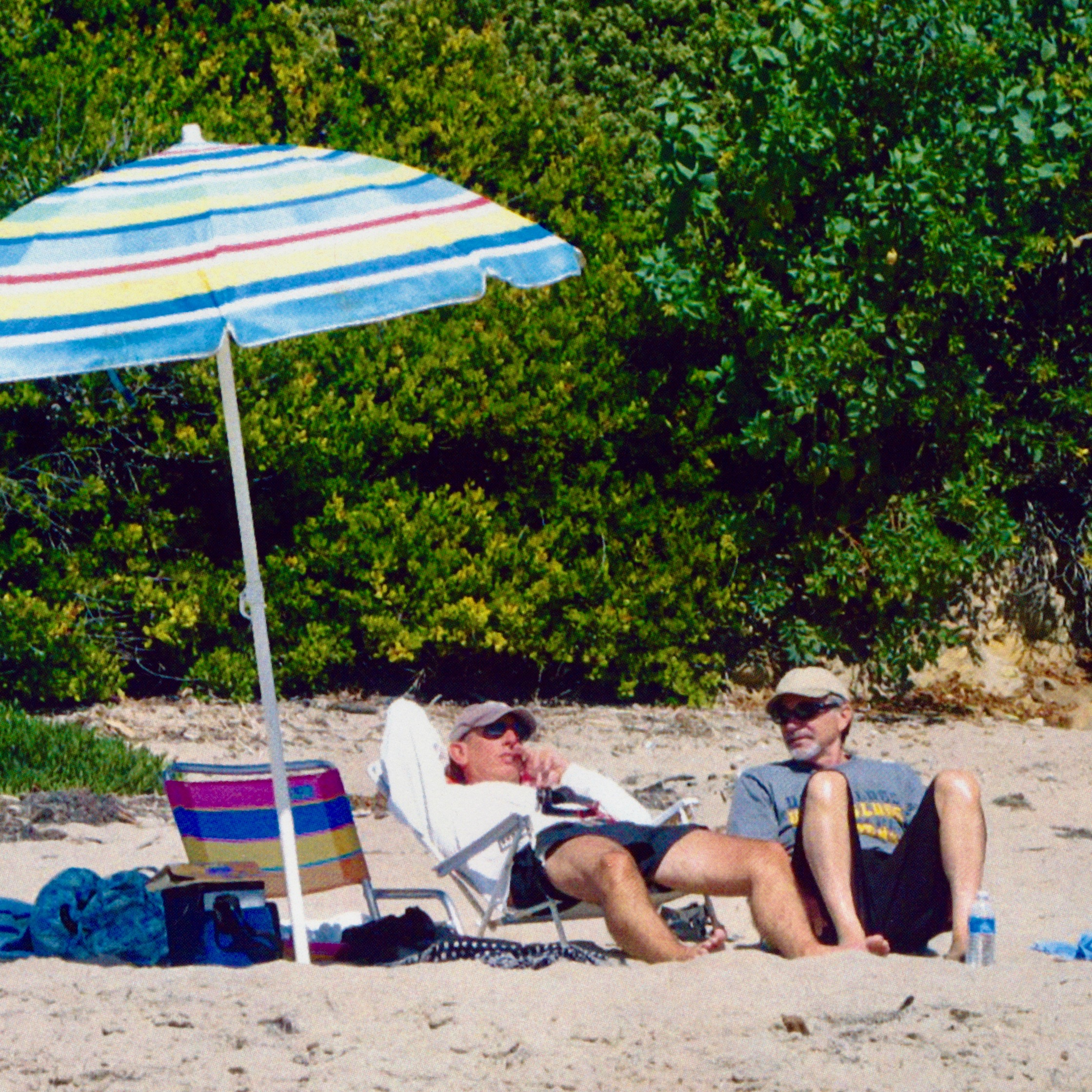 | This picture would be identical in any summer over the past several decades: Carl Herzig and I talking about everything and nothing at Bates beach around the corner from Rincon, with Stella on camera ... and, over the years, their kids Liana, Jam and/or Irene playing in the sand or ocean or with us: one of the most constant and nurturing rituals of our lives |