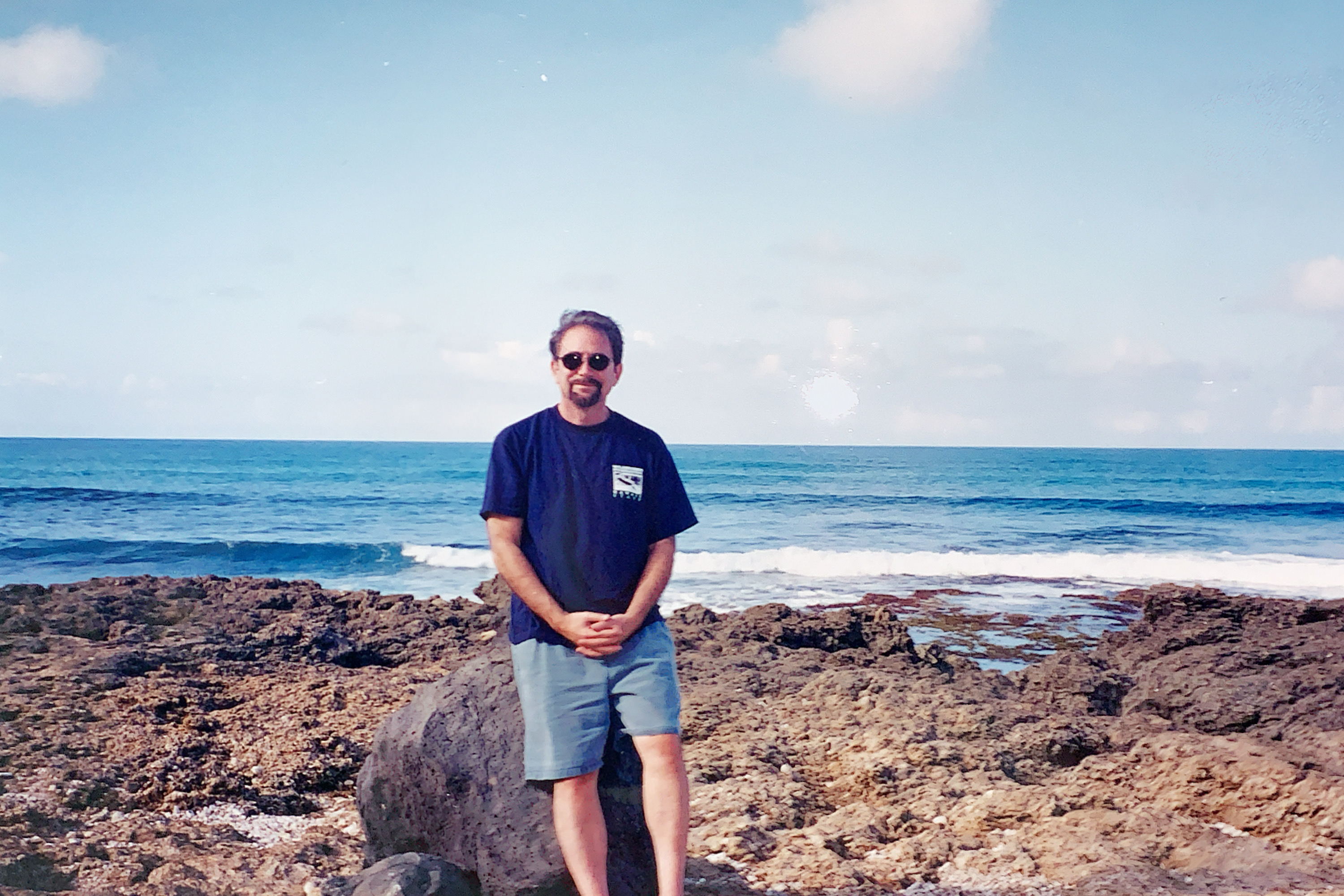 | Janni at Ka'ena Point with lave scrub and rugged volcanic Waianae range in background |