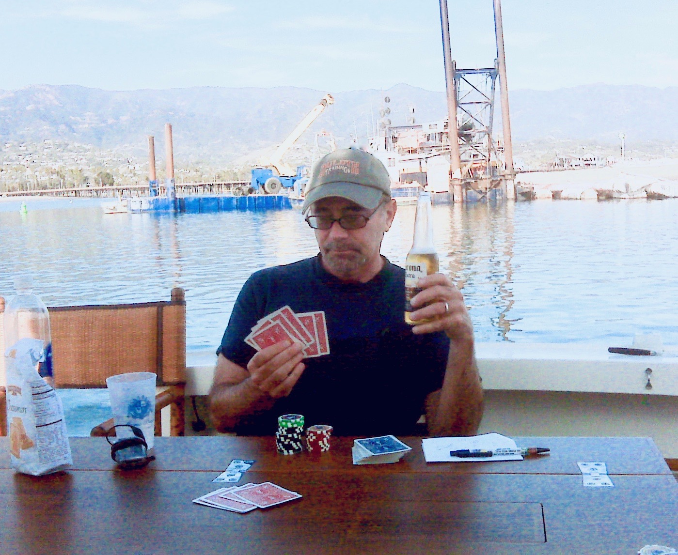 Civilized times: six-card Omaha hi-low split poker aboard friend Michael Haber's craft in Slip 1, Santa Barbara Harbor, October 2008. The cerveza is obviously a prop, as I'm exclusively an herbivore |