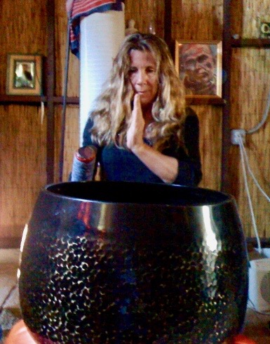 | ... speaking of Deer Park, here's Sangha sister and corazón con cola Chris Dawkins leading Thầy-informed meditation practice in her garage on Shoreline Drive – converted to the then-thriving and whimsically deep Wabi Sabi Sangha – with the one bowl of true power |