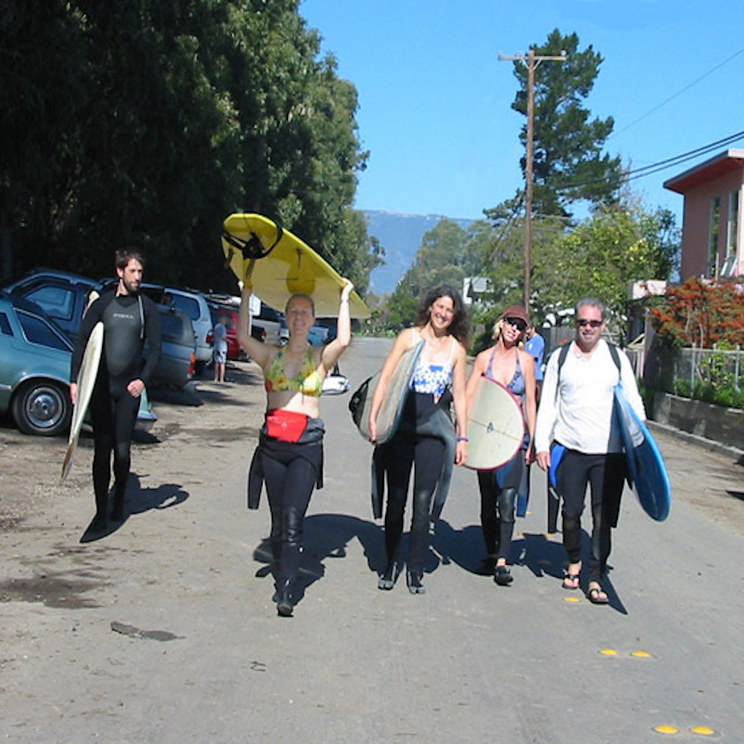 | January 2005: some of the Salty Sisters & Briny Bros heading out at Devereux, Isla Vista: with Ben Colman, Corinne Williams, Maura Jess, and Sara Soltau |