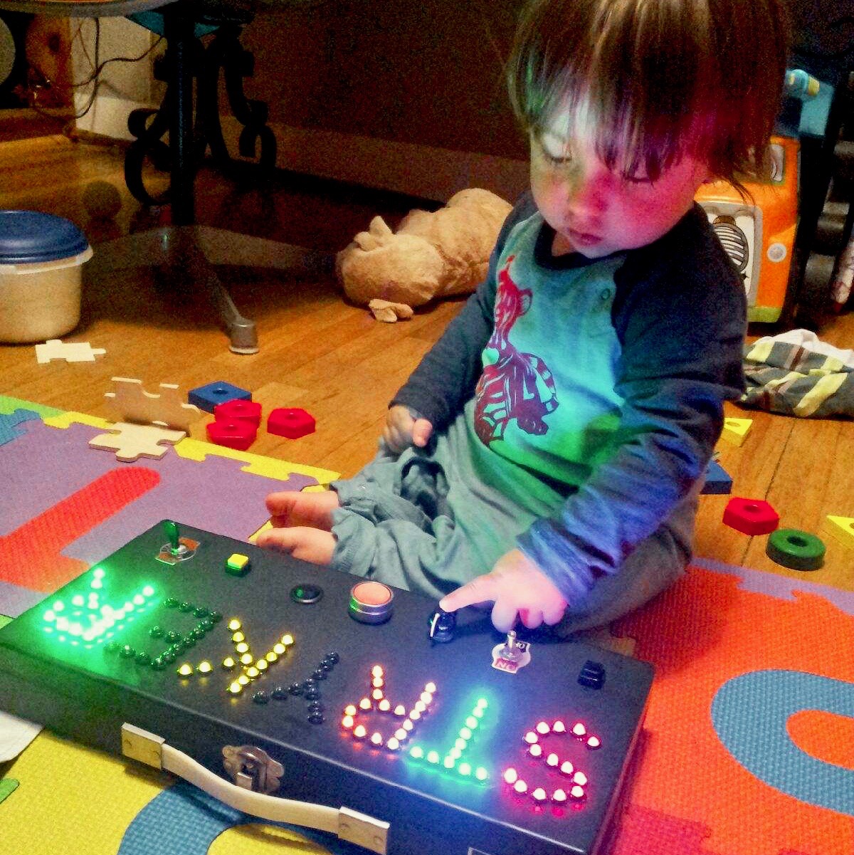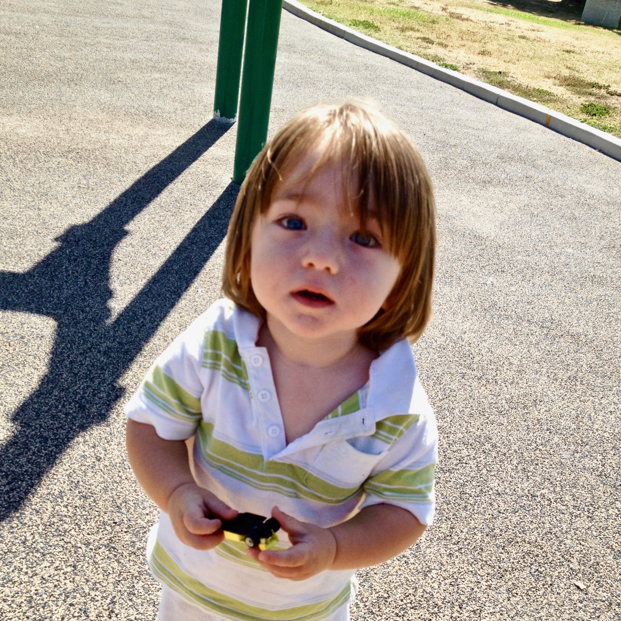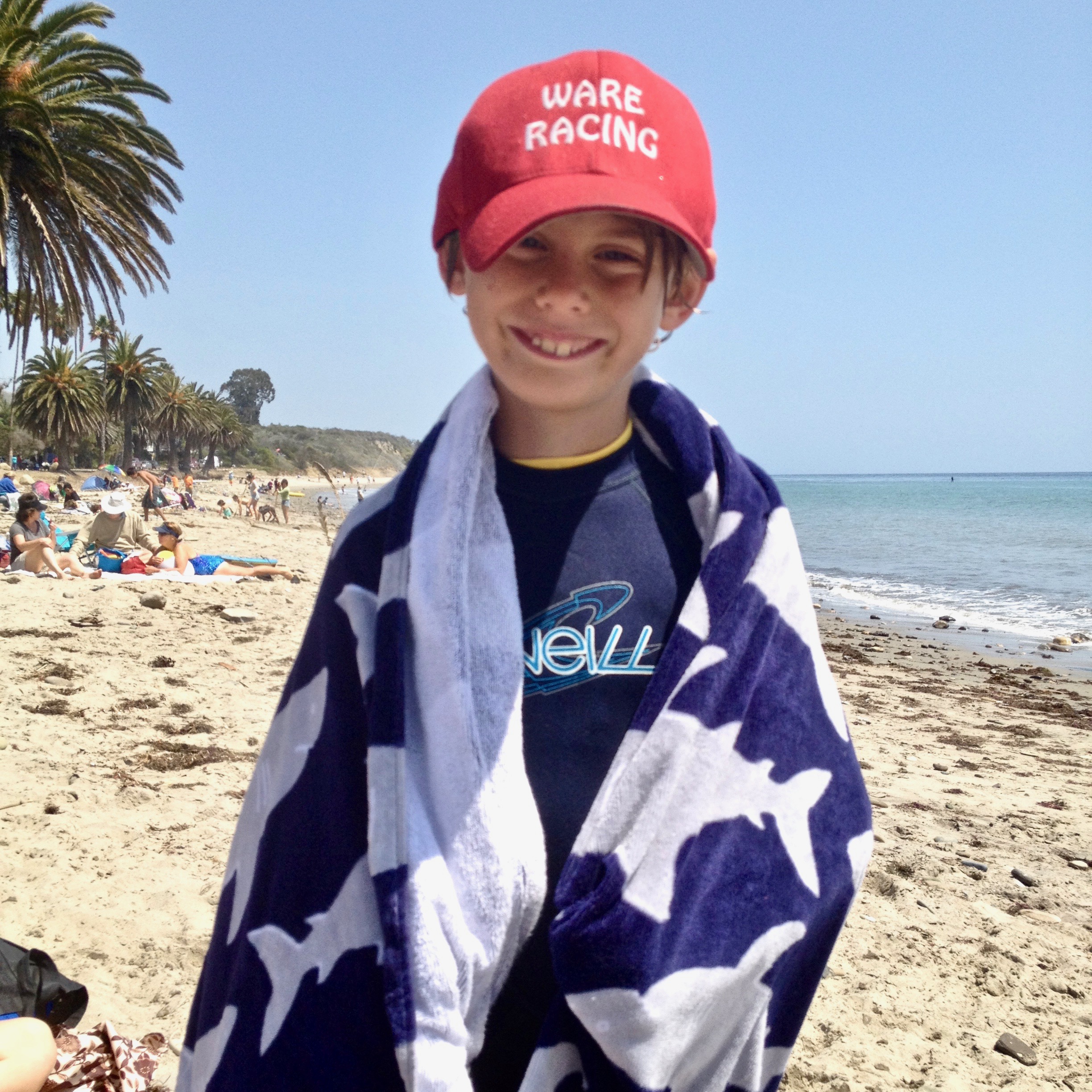 Leif in Connie's dad's Three Quarter Midget Racing hat, Aptil 2014
