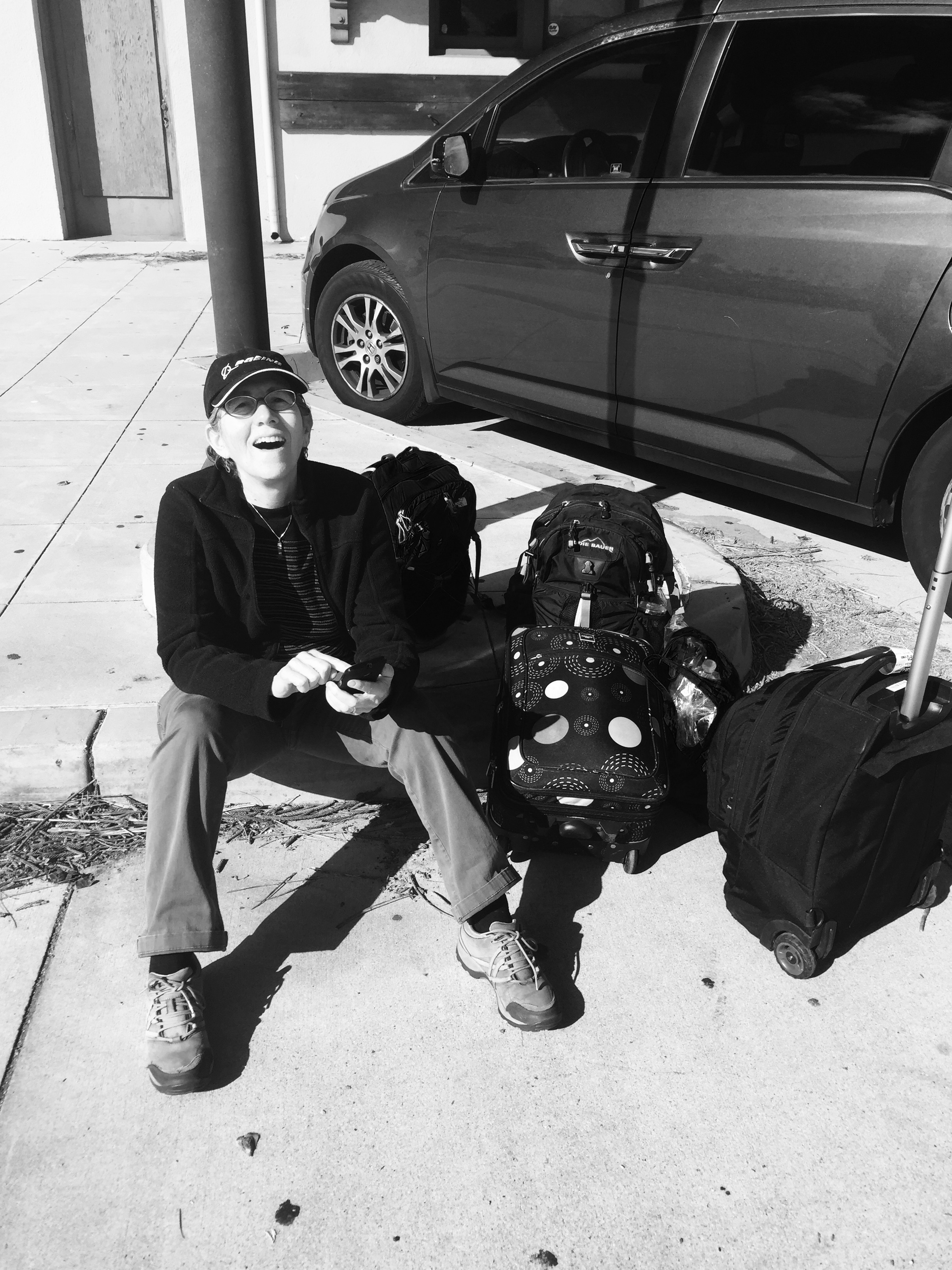 | Froofy the intrepid wayfarer, waiting for the train as 2015 draws to a close. In the background, my intrepid Odyssey van that took me faithfully on many surf trips and outings with the boys ... and was stolen from my carport a few days before this writing. I hope the catalytic converter went to a good home. |