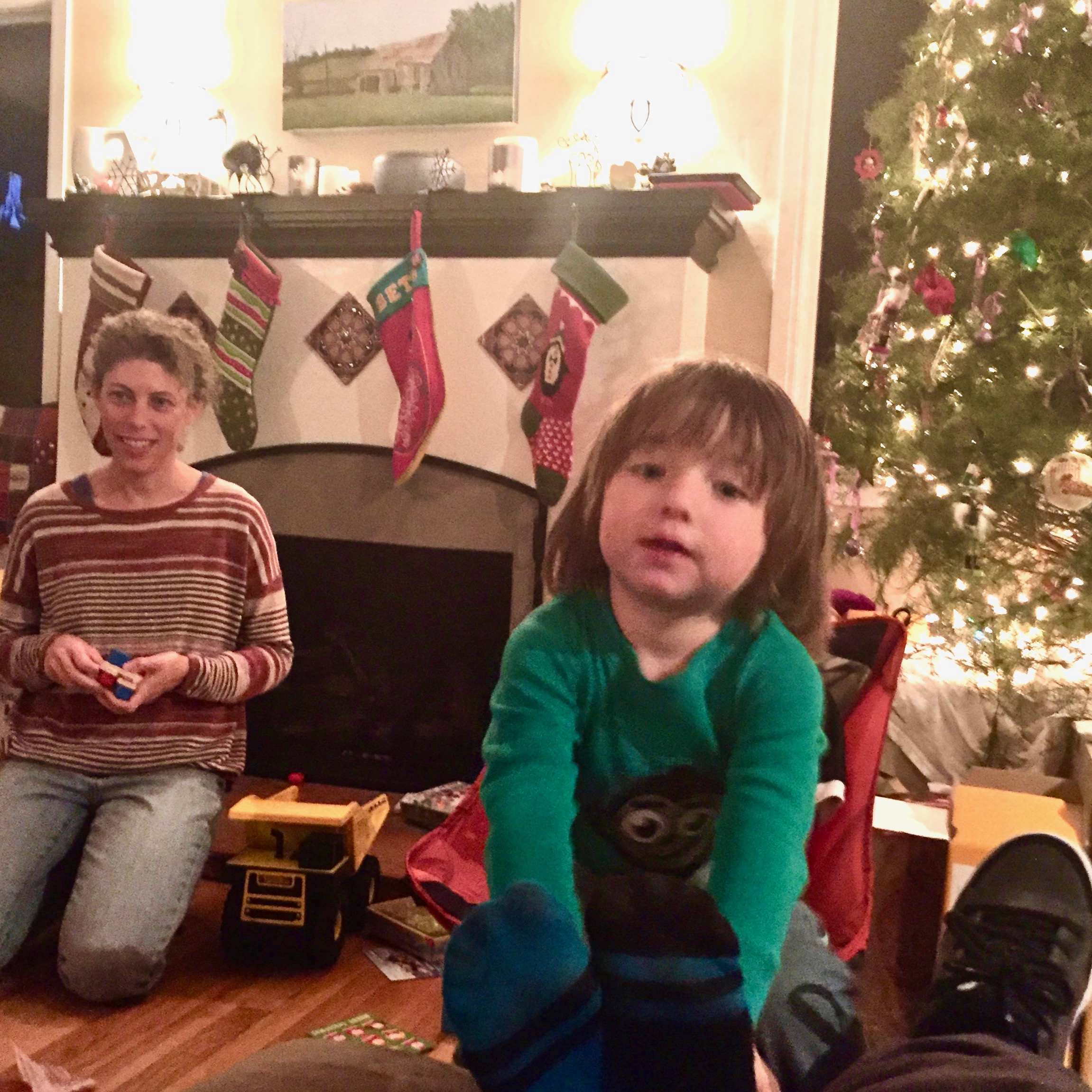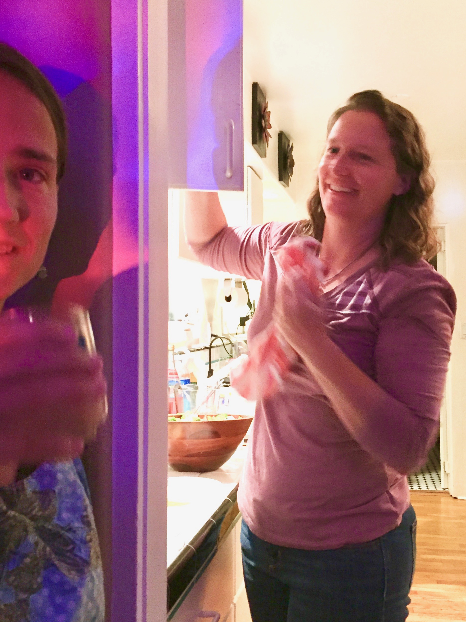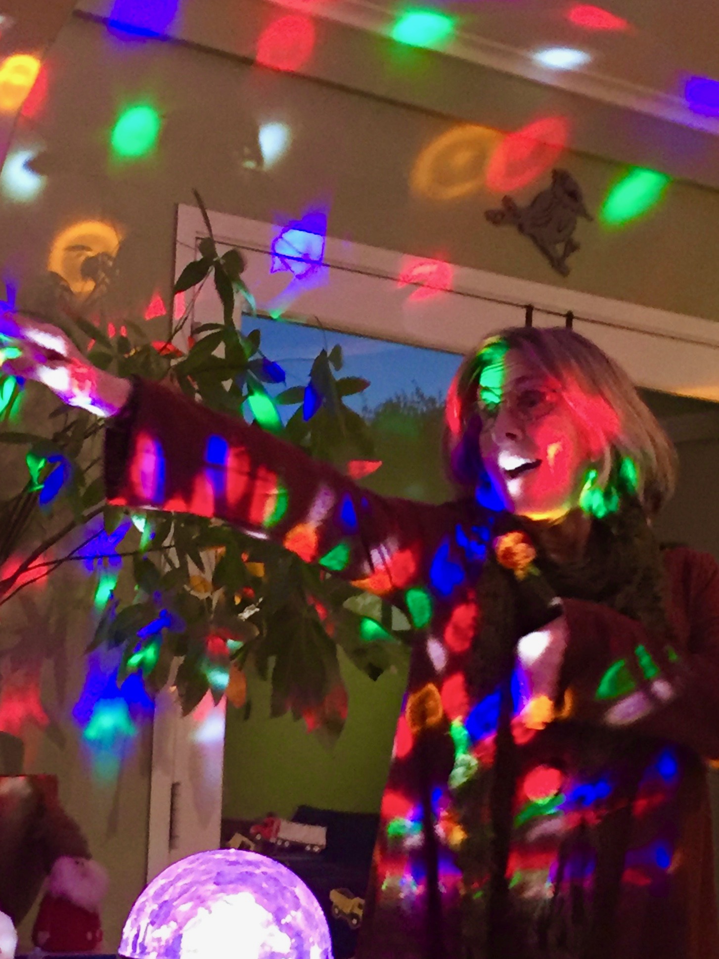 | Christmas 2015 casa Kirby, complete with light show bathing Chris in celestial light; also Jade, Soren, Leif, Francie, Gordon, Beth, Annie, amd Lisa. Eric is in the easy chair, relaxing with a cold one. Beth's parents are in the house but must have been hiding from the photographer ...? |