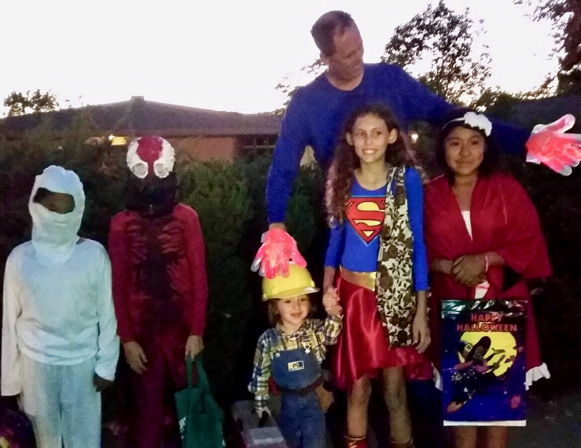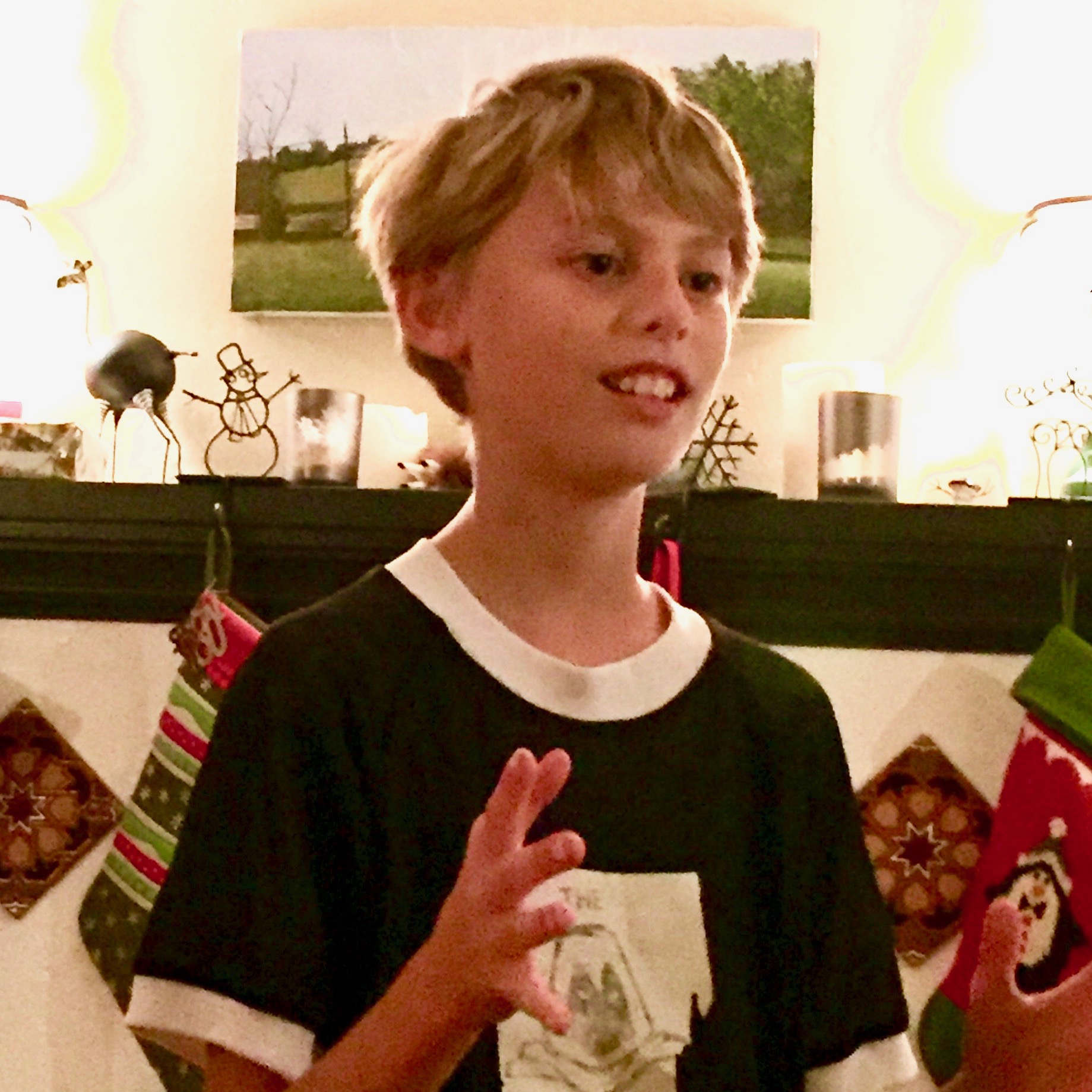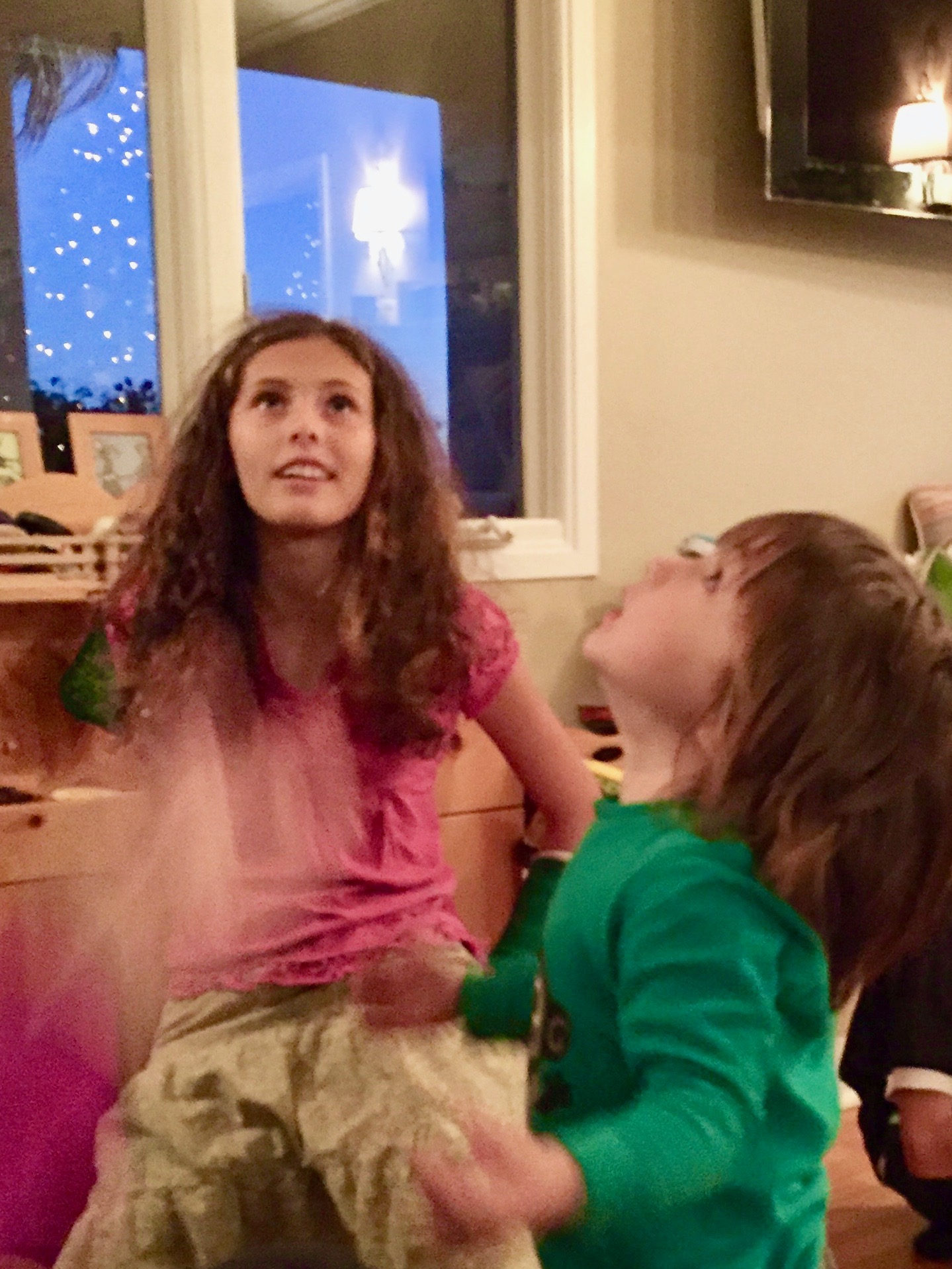 | Christmas 2015 casa Kirby, complete with light show bathing Chris in celestial light; also Jade, Soren, Leif, Francie, Gordon, Beth, Annie, amd Lisa. Eric is in the easy chair, relaxing with a cold one. Beth's parents are in the house but must have been hiding from the photographer ...? |