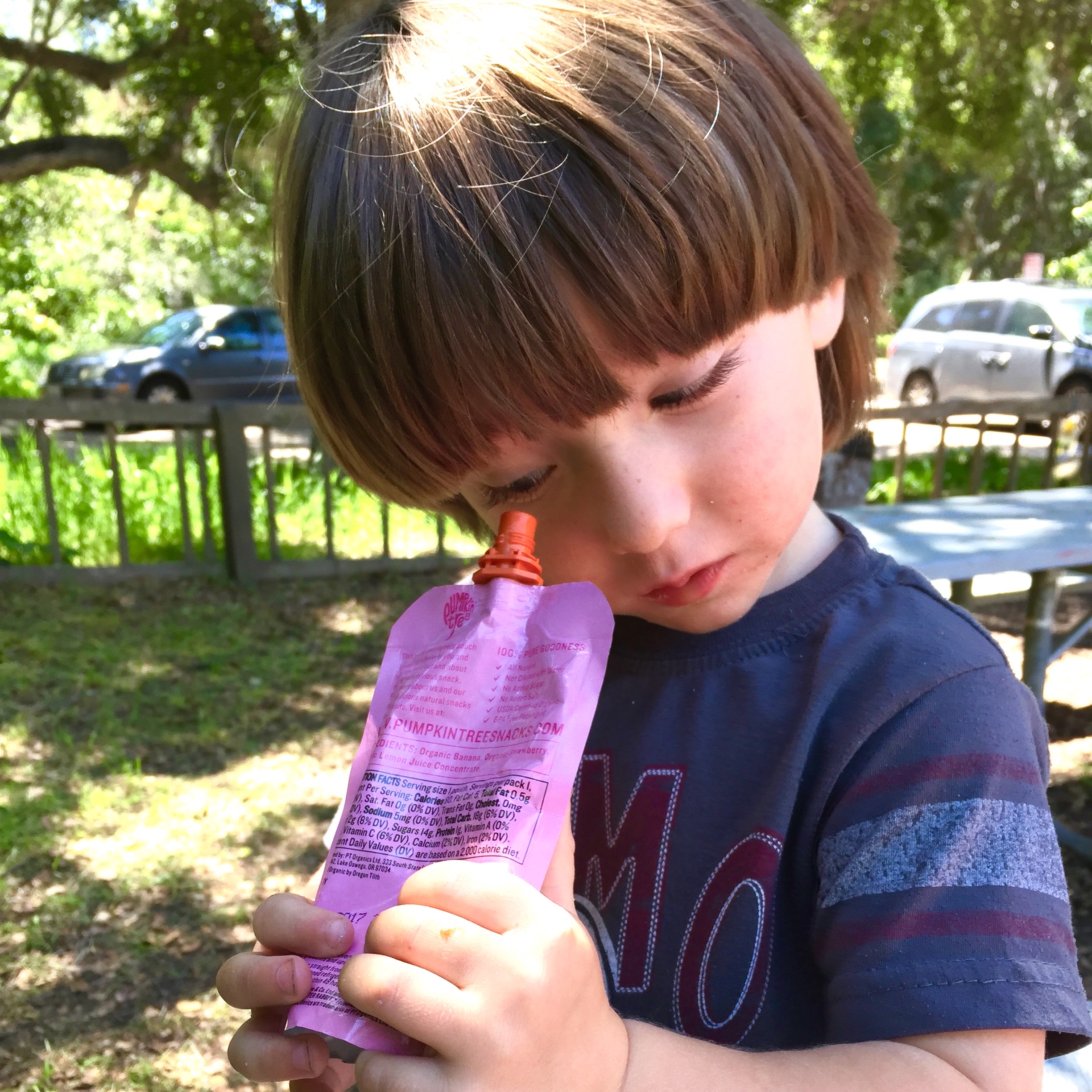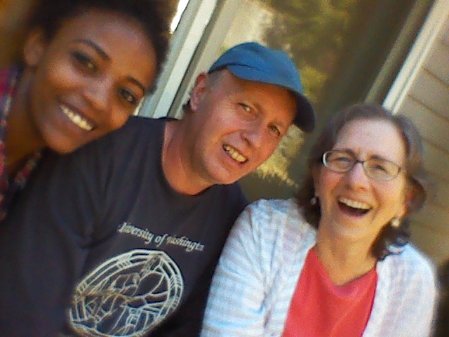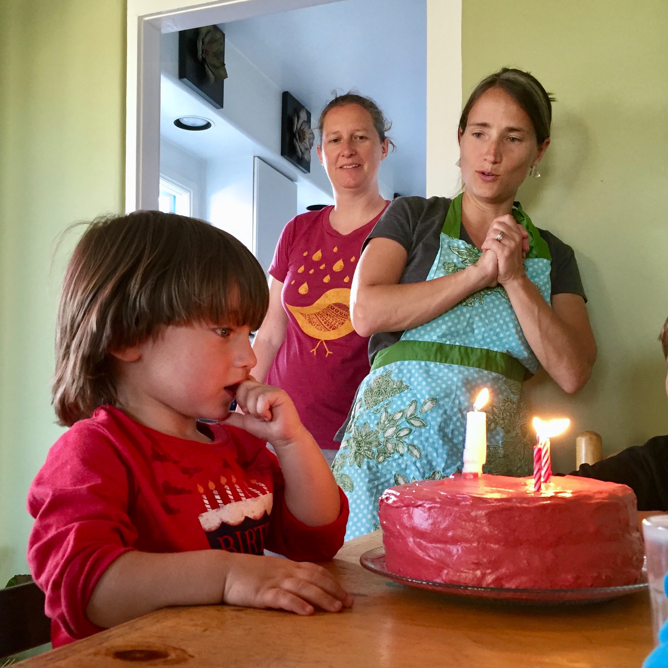 | Soren with some watermelon on his arm, Beth and Lisa in the background, same day at Campus |