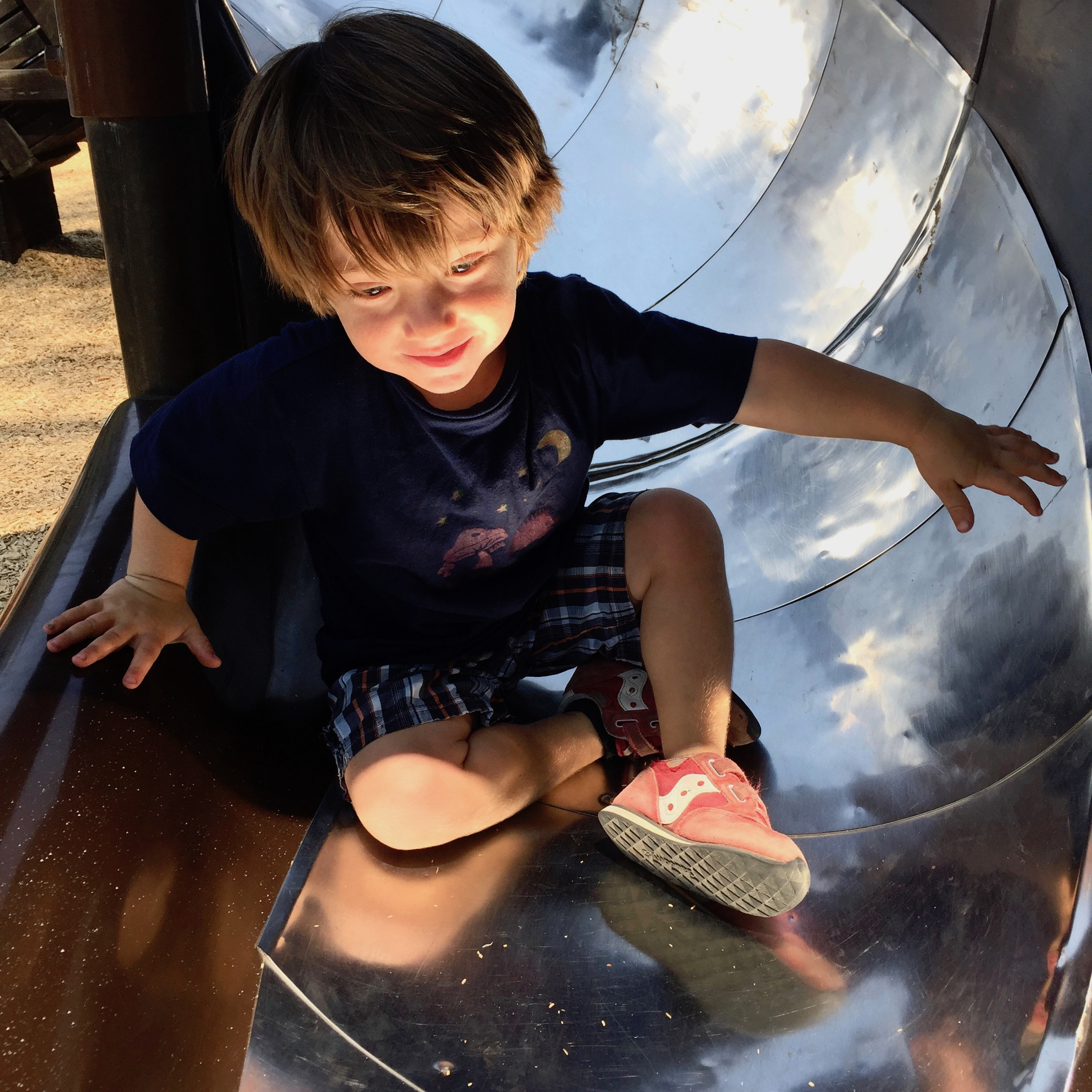 Soren sliding at Kids' World, August 2016