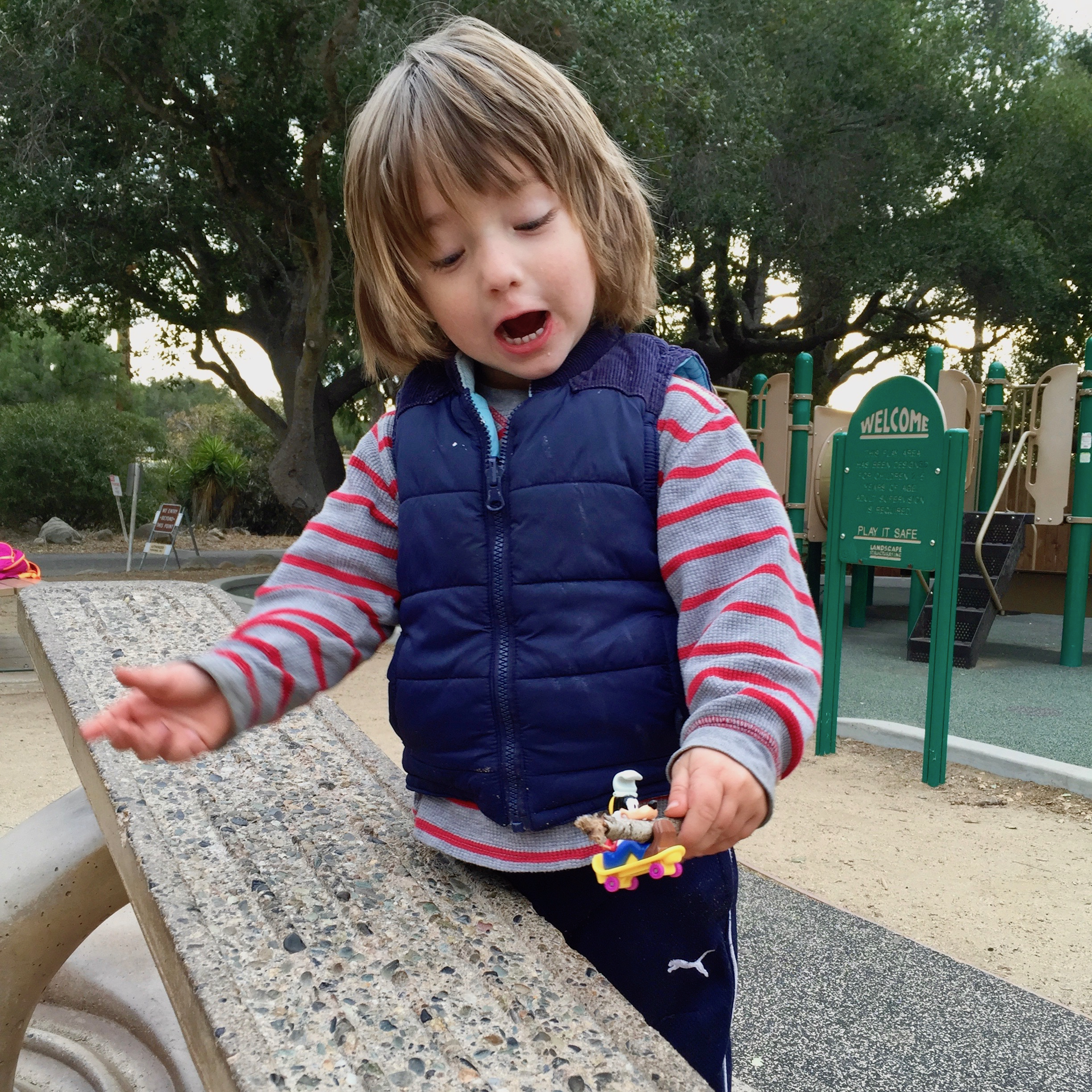| 1/2/16 Soren shows Goofy how to perform a massive ollie while we wait for the holiday mini-train at Tucker's Grove park, Goleta |