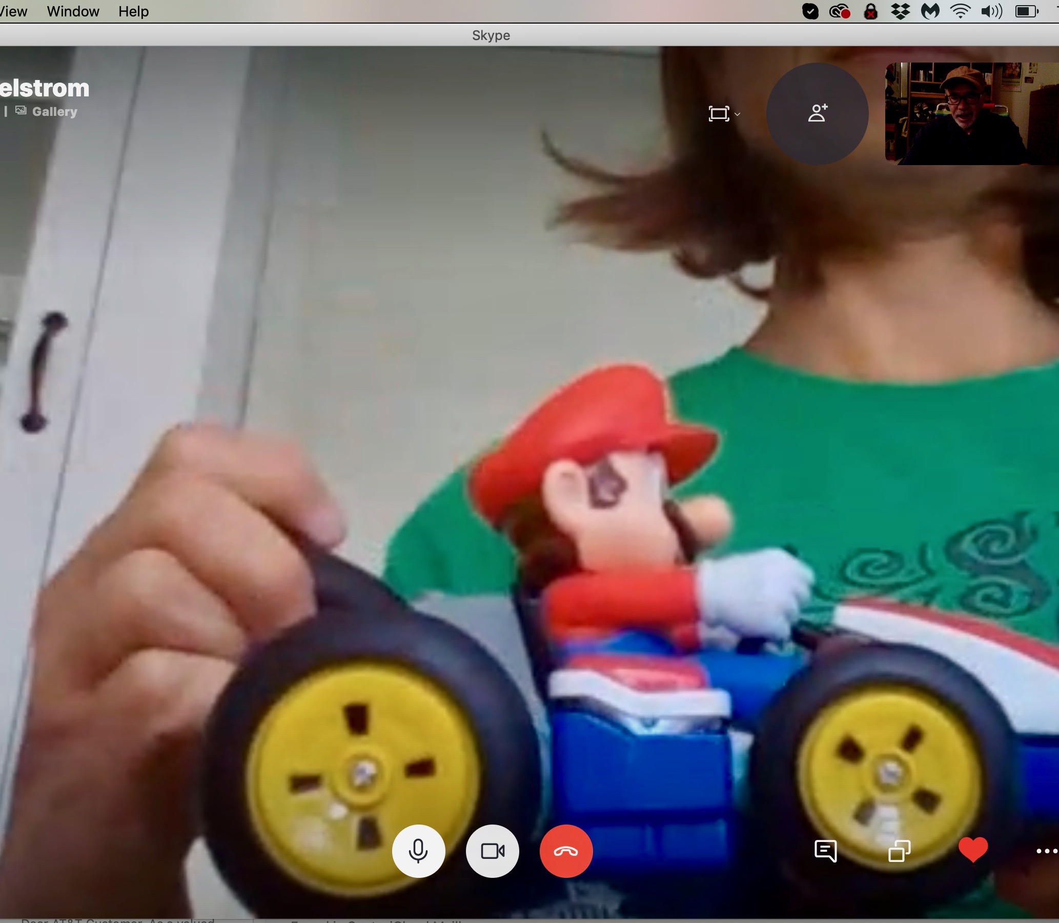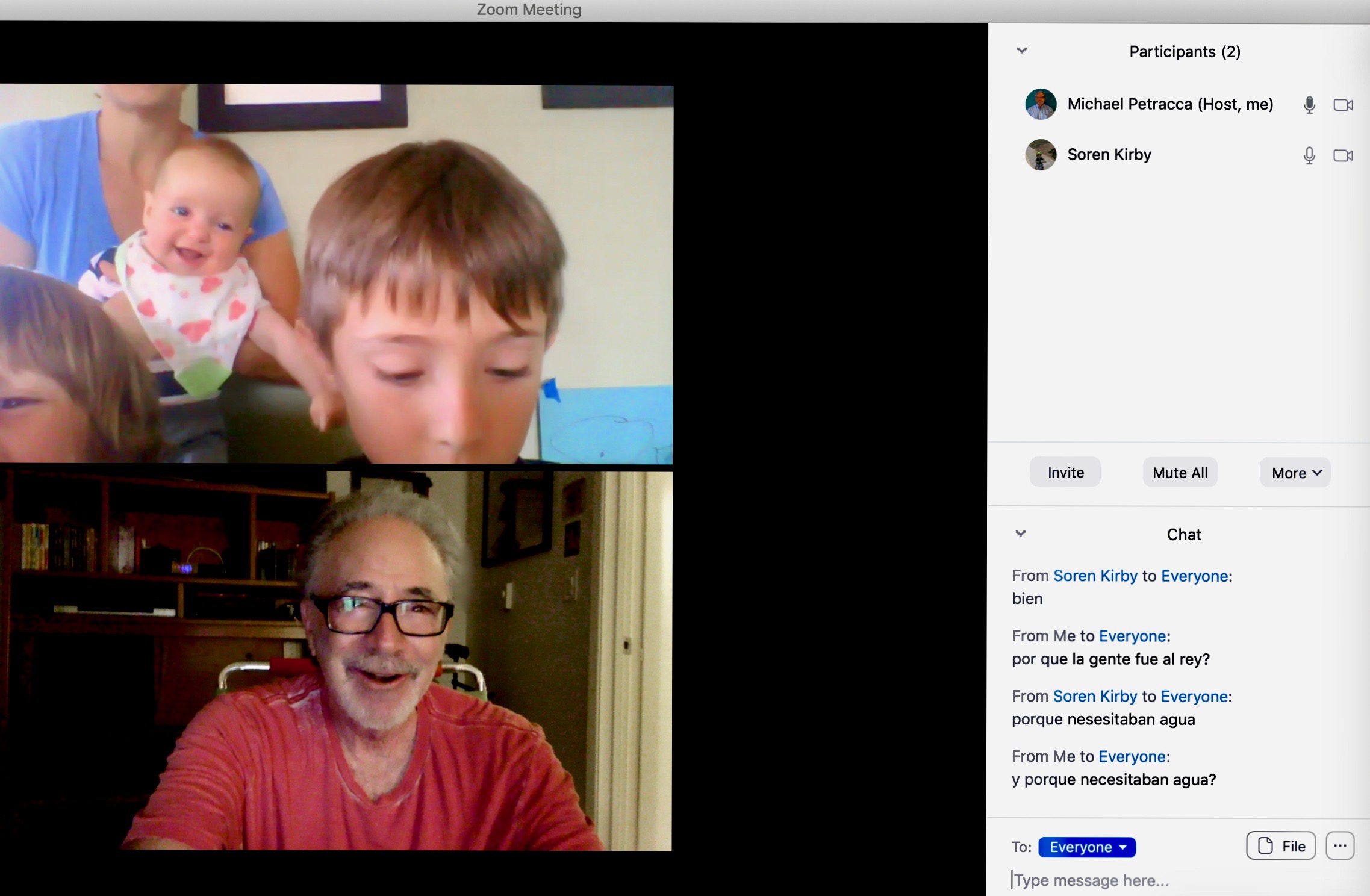 | 2020 seems to have turned into a blog, since I'm now reporting on the present. We're still in full quarantine mode. Soren's school is over for the summer, so I'm not doing Zoom meetings with him every day to work on his Spanish homework and play on the whiteboard. Instead, we're having summer camp on Mondays, Wednesdays and Fridays, with me reading books to both sons and doing some Spanish with Soren. We've only been doing this a couple of weeks, but so far it's great: the boys make a fort under the dining room table and take the computer with them, and I am reading Mr Mister and Little Miss books by Roger Hargreaves, which they both enjoy. Here a screenshot of mis hijos under the table, listening intently, and all three Kirbykids while Zooming. I miss hanging with them all in person, but these virtual meetings are a joy. Thanks to the moms for facilitating! |