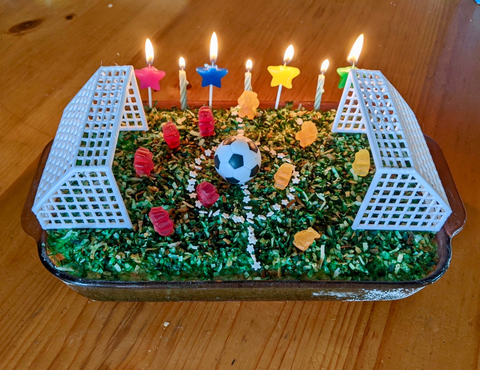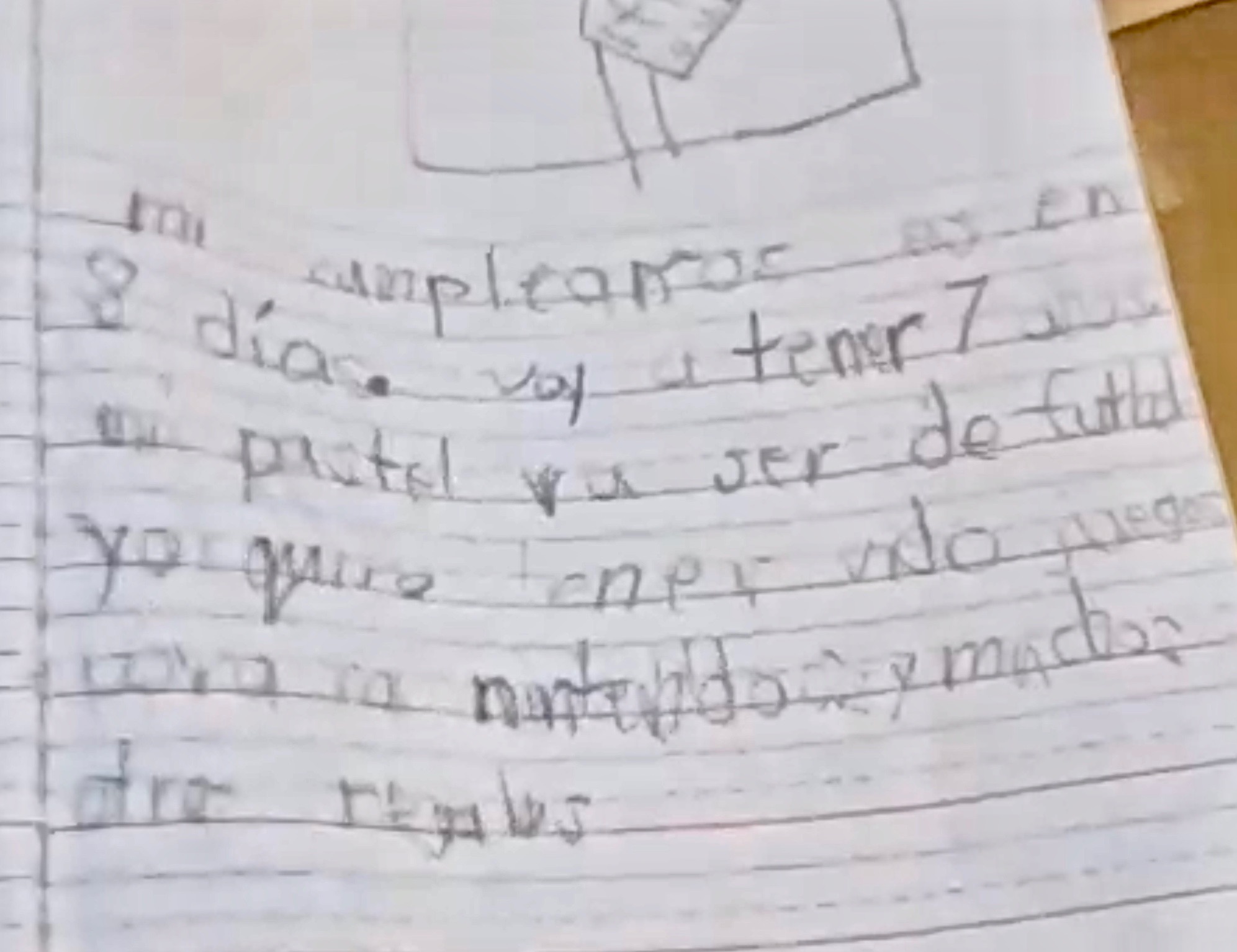 | April 14: Today is Soren's 7th birthday! First we did our Skype writing class; his four sentennces read, "Hoy es mi cumpleaños y tengo siete años. Mis mamas y mi papa y mi hermano me dieron muchos regalos. Mi pastel esta hecho sobre futbol. El pastel esta hecho con coco y un campo verde." It's hard to capture pencil writing through Skype via screenshot, but here is sort of what it looked like: |