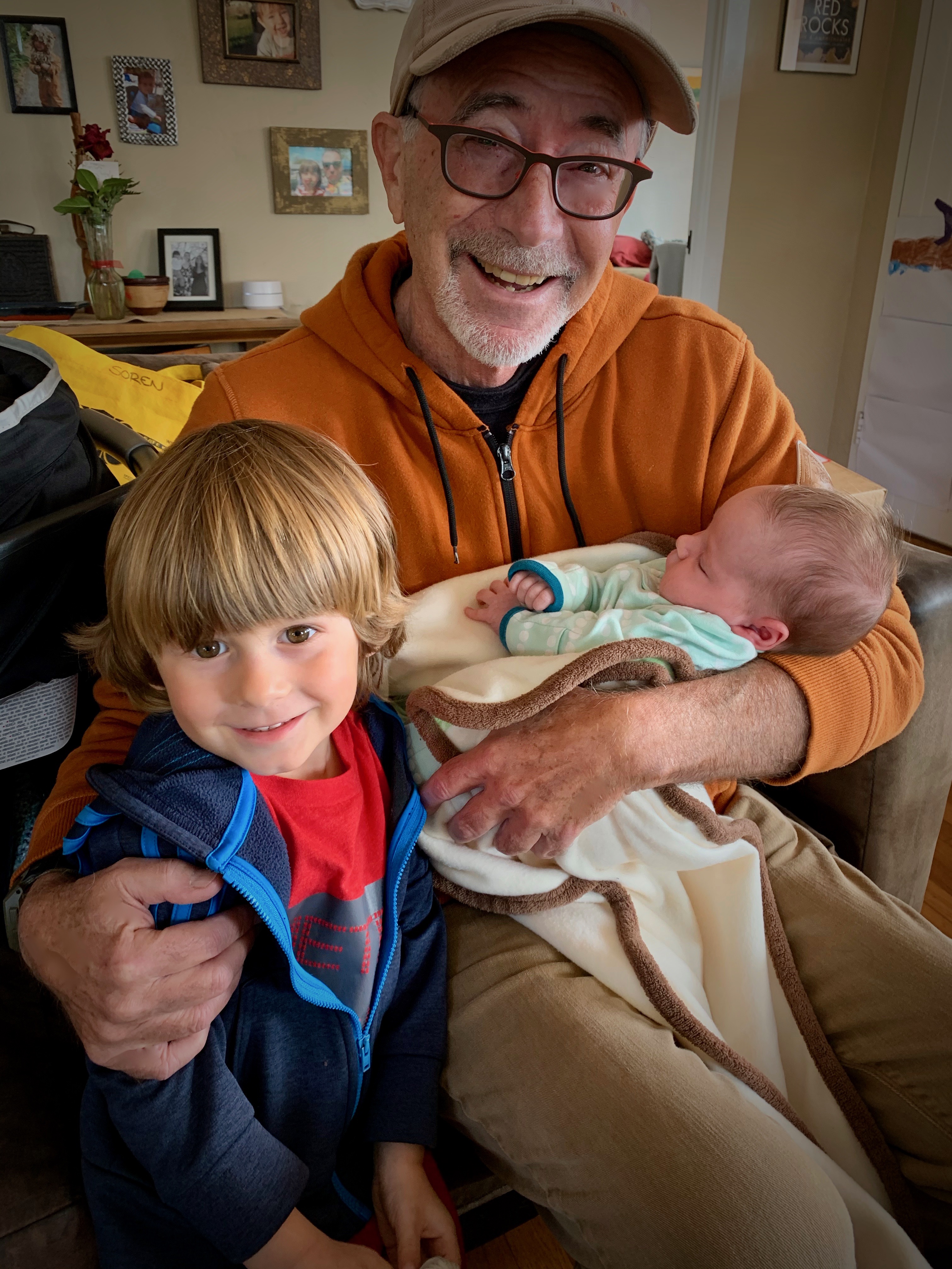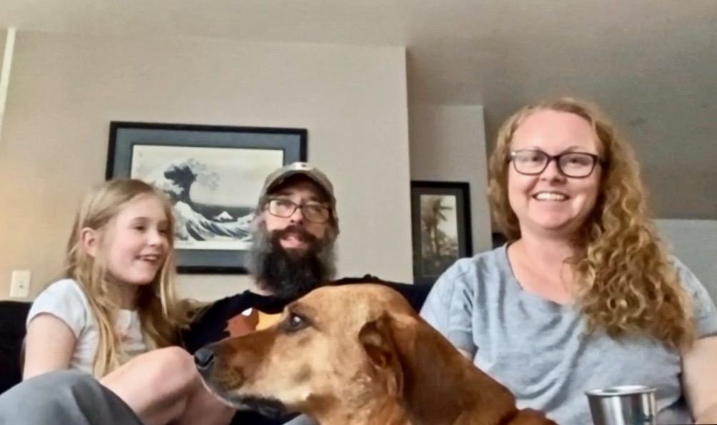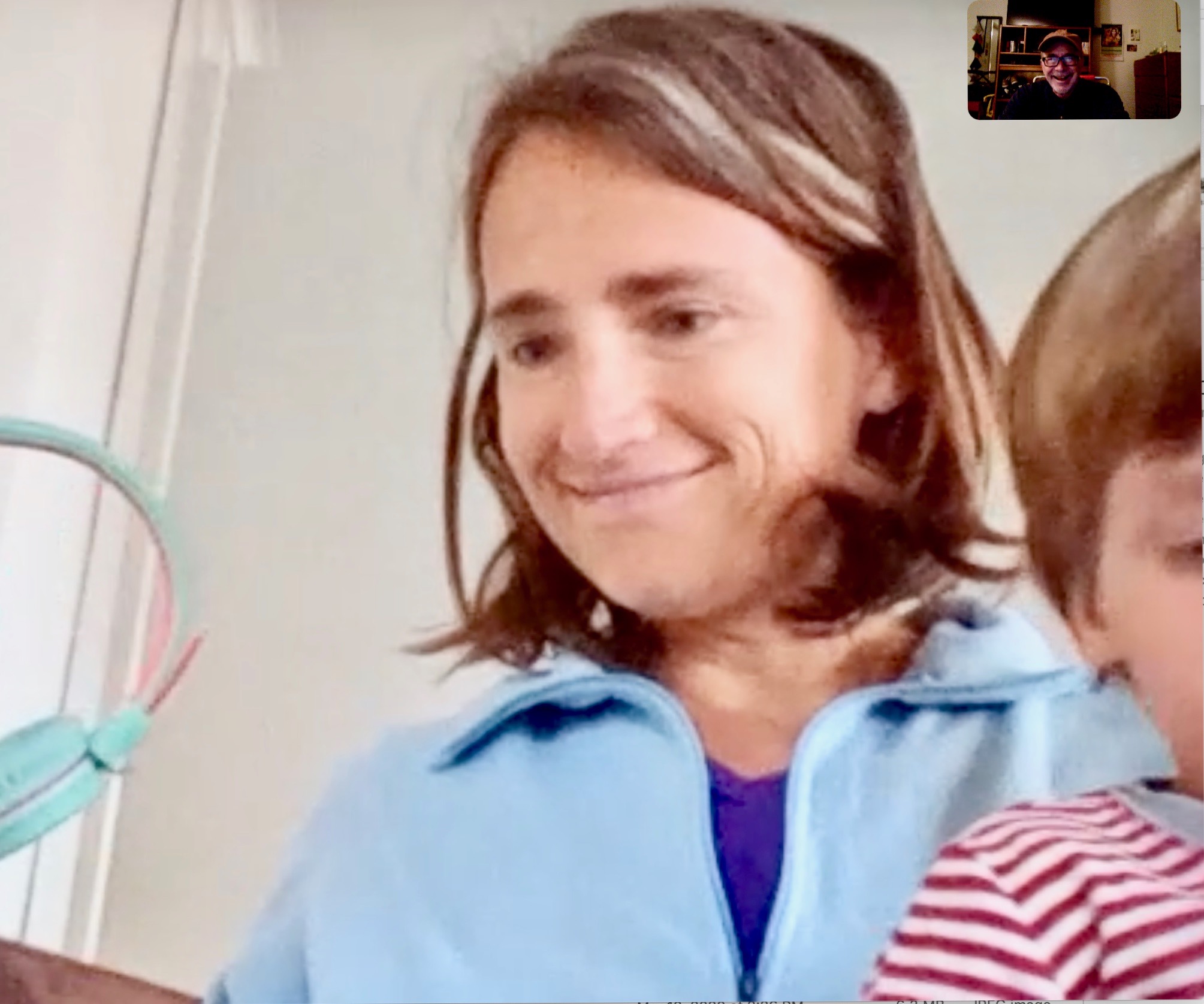 | Sweet post-birthday Zoom today with Ben and Corinne and Parker and very good doggie whose name I forget. |
