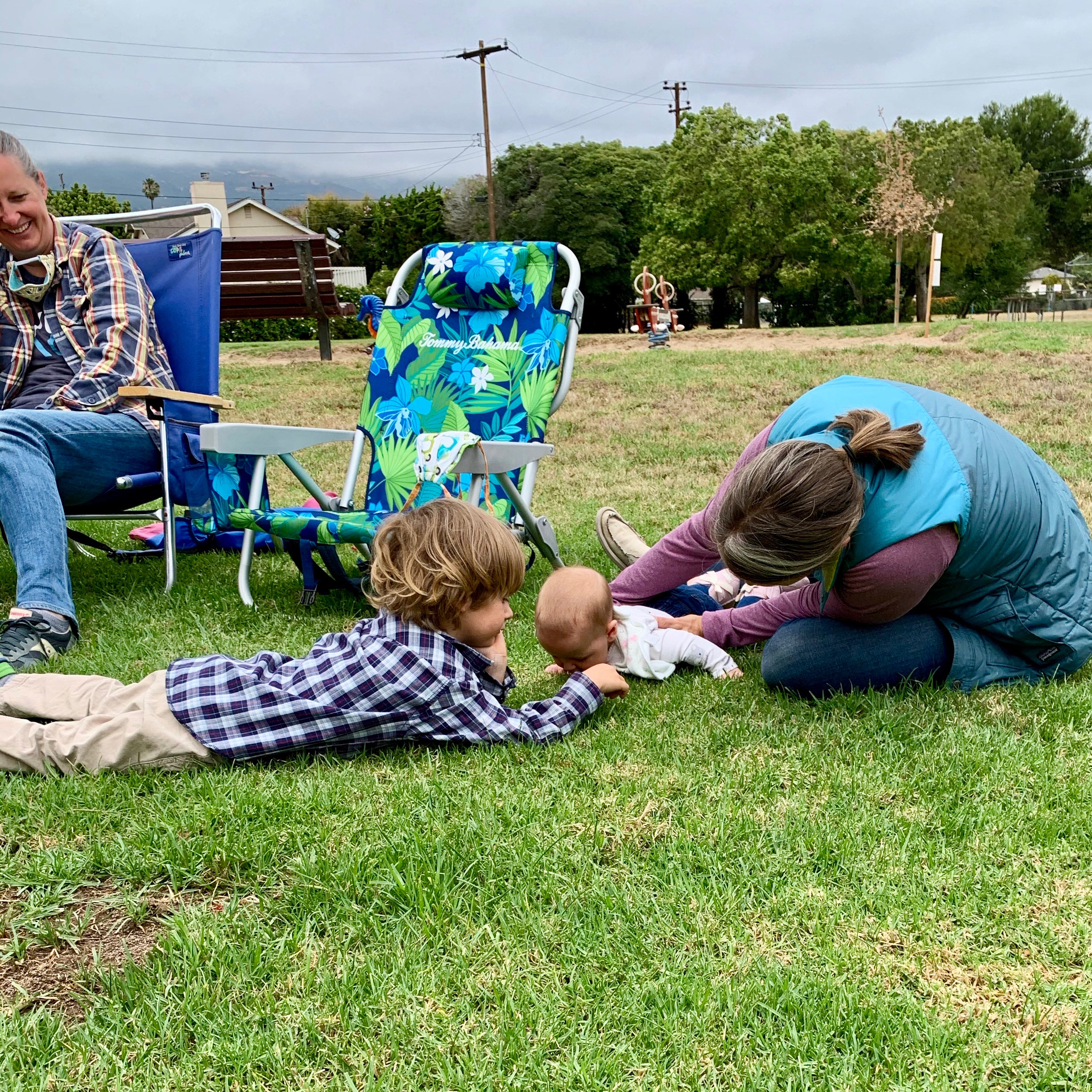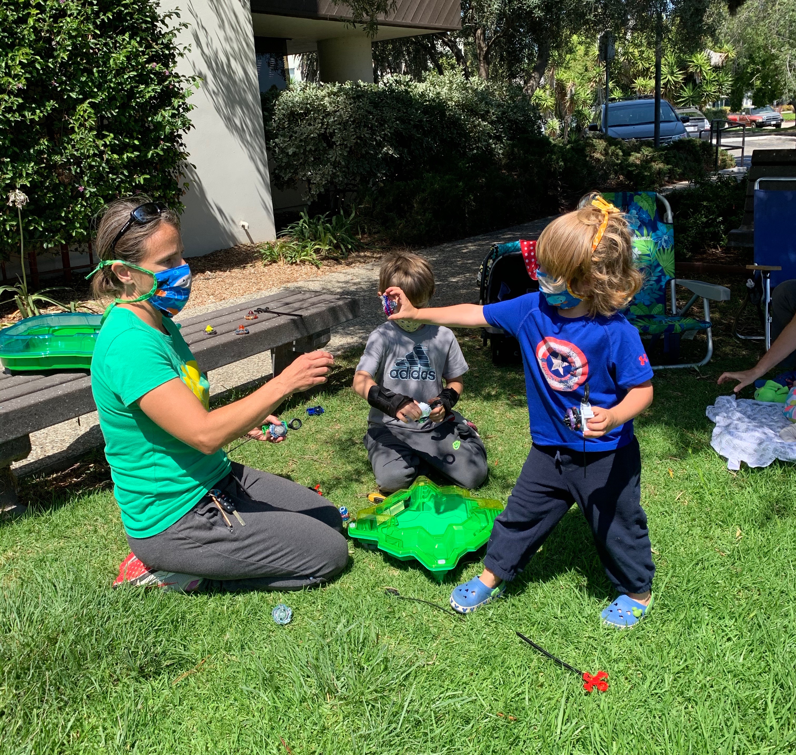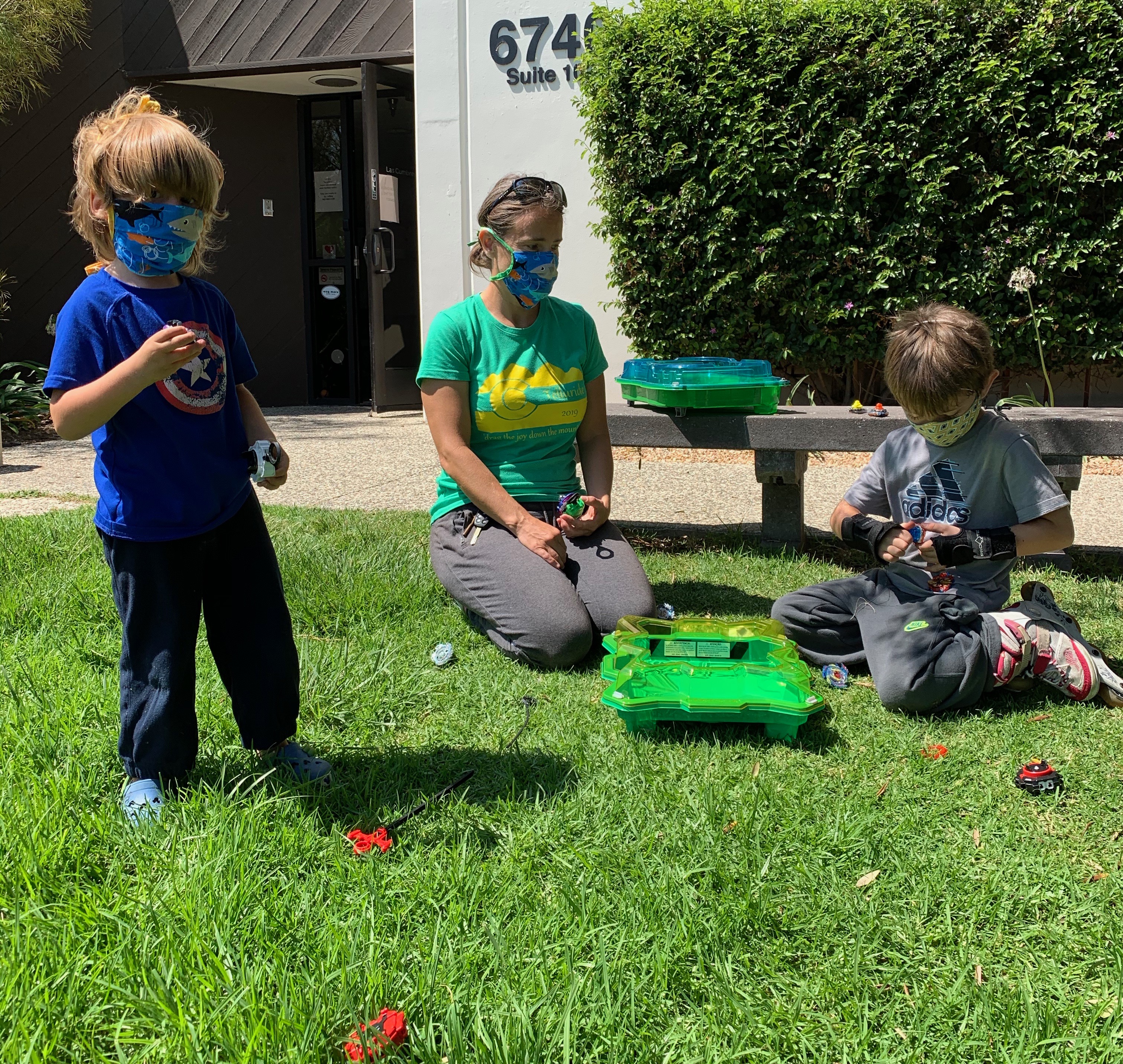 | Today is my birthday. Arranged to meet with the moms and the kids at Annie's place of work, Las Cumbres Observatory, where she has been going in several times a week during quarantine. We met on the lawn in front of her office in Goleta. The boys and I brought our Beyblades, and we all had loads of fun playing and talking. Sunny summer afternoon on the lawn, energetic conversation, Devon being exceedingly cute ... in all, a perfect way to turn 73, never mind the current circumstances. |