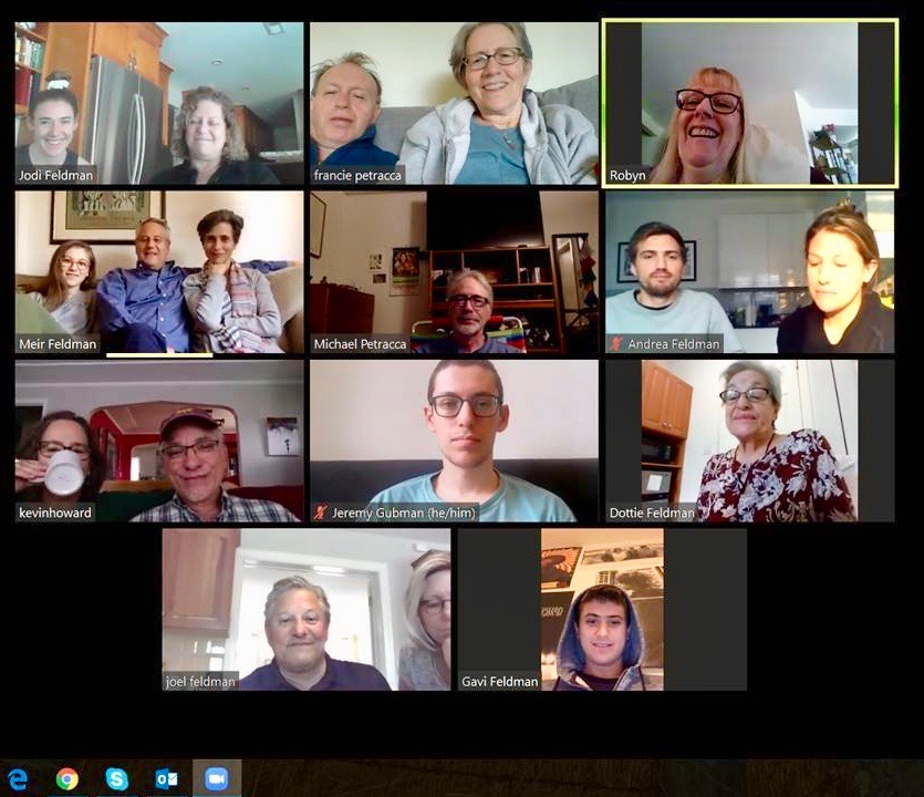 | Below: a Zoom family reunion during quarantine: descendents of the original Zveetkees/Sweet side of the family; in other words, many cousins, one aunt (Francie), one uncle-in-law (Gordon), and a father (me) of the two boys in the above picture ... which makes Soren and Evett distant cousins to all these folks also! |