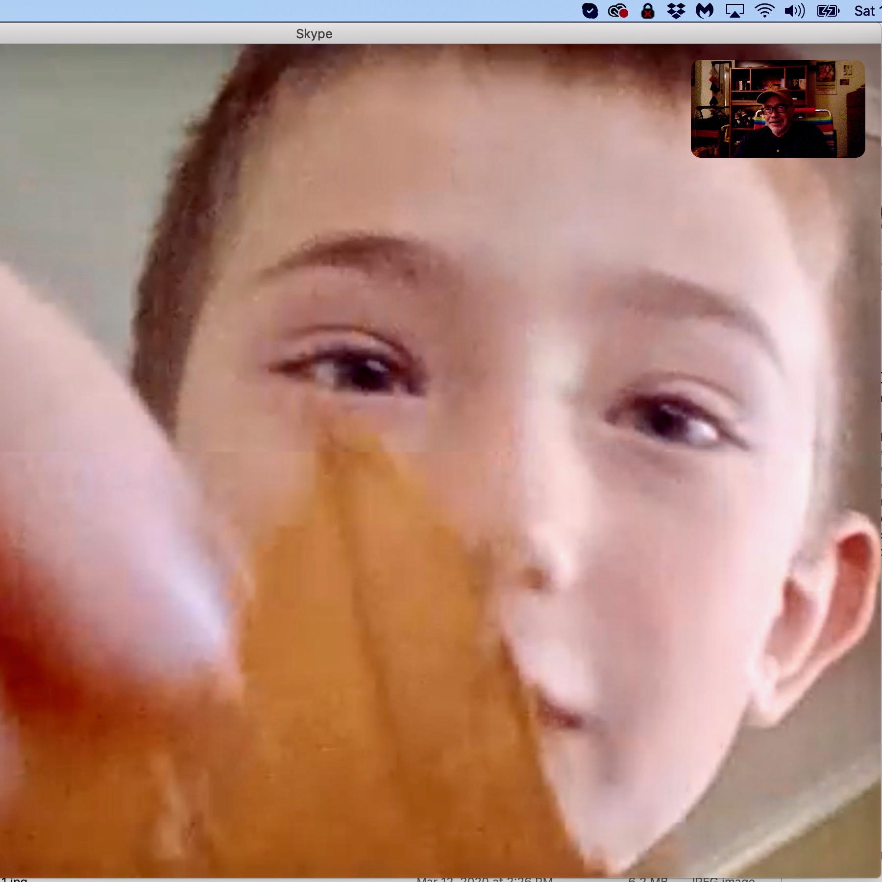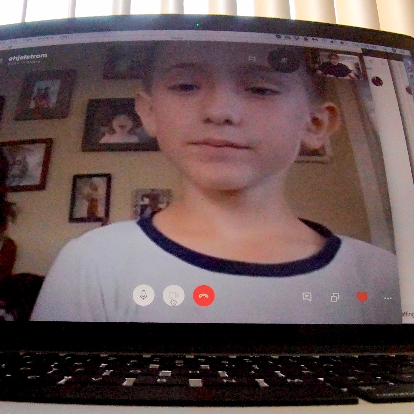 | April 2, 2020 Soren preparing for first Skype writing class. Today's story: family walked to the high school, where there was a hill. Soren climbed it and then slid down ... all rendered in most excellent Spanish! |